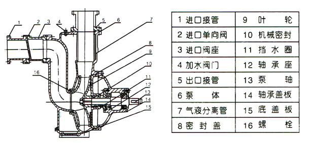 ZW型自吸式無堵塞排污泵,主要由泵體、葉輪、后蓋、機械密封、泵軸、軸承座、進口閥、氣液分離管、加水閥門、進、排接管等組成。泵的結構見下圖。